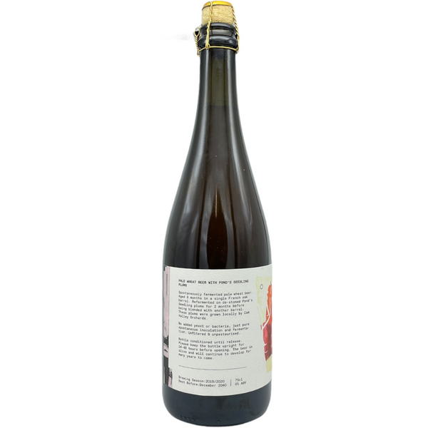 Process: Pale wheat beer spontaneously fermented and aged for 8 months in a single 400 litre French oak barrel. The beer was moved onto de-stoned Pond’s Seedling plums in tank. It was punched down daily until refermentation had calmed. The beer was on fruit for 2 months. We then blended back with another barrel containing our base wheat beer before packaging. The plums were purchased from Cam Valley Orchard which is situated very close to the Blendery.