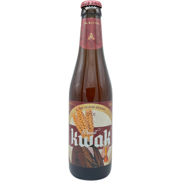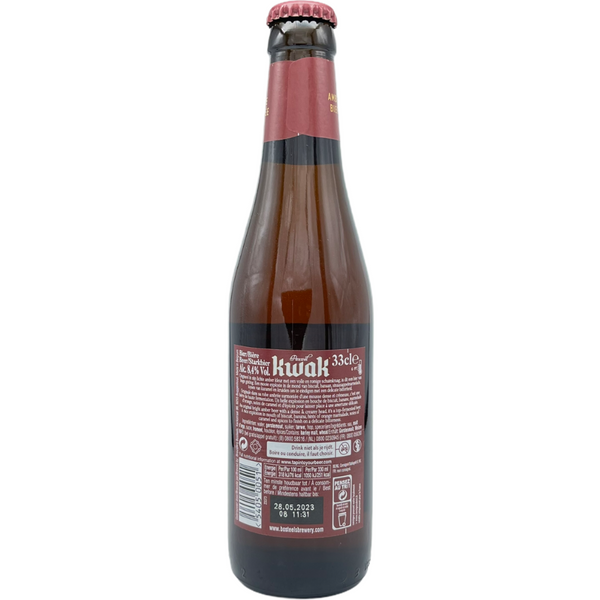 Kwak is a traditional strong Belgian amber ale, a perfect blend of malt and hops with a great complexity of flavour. The Kwak beer is recognizable by its deep amber, clear beer with a dense, creamy-coloured head. The white wood support offers a nice contrast with the beer. A balance of dark caramel, dried orange, a hint of banana and baking spices with a touch of earthiness Medium-bodied with a soft, mellow warmth. Flavours include gentle allspice, baked caramel and banana with notes of orange marmalade. Spice and a warming character linger on the finish with a delicate bitterness.