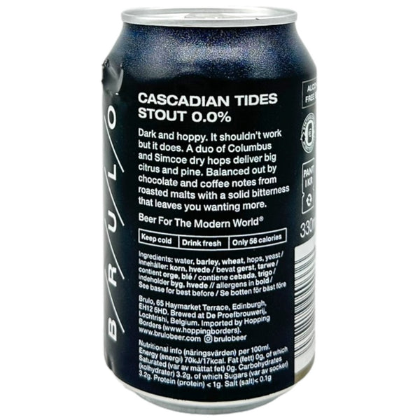 Brulo Cascadian Tides Stout stands as a beacon of craft beer excellence, offering a rich tapestry of flavours and aromas that speak to the discerning palate of stout lovers. Crafted with precision and a deep respect for brewing traditions, this stout is a testament to the artistry involved in creating a beer that's both complex and delightfully indulgent. The stout features an intricate blend of premium ingredients, including carefully selected malts and hops, which come together to create its distinct character. Each sip reveals layers of depth, beginning with a robust foundation of roasted malts that impart a deep ebony hue and a creamy, tan head. True to its style, Brulo Cascadian Tides Stout offers an olfactory journey with aromas of dark chocolate, rich coffee, and a hint of caramel sweetness, intertwined with subtle dark fruit undertones. This richness carries through to the palate, where the flavours of dark chocolate and coffee dominate, complemented by nuances of caramel, toasted nuts, and a gentle berry-like sweetness. The beer's full-bodied nature is balanced by a smooth, creamy mouthfeel, making each sip a luxurious experience. The finish is a masterful blend of malt sweetness and a slight hop bitterness, leaving a lingering taste that invites further exploration. Designed for those who appreciate the finer aspects of a stout, Brulo Cascadian Tides Stout is more than just a beer—it's a celebration of craftsmanship, flavour, and the joy of a perfectly brewed stout.