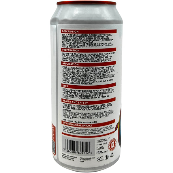 PVA is a double-mashed, double-centrifuged, triple dry-hopped DIPA that features the freshest available US & New Zealand hops. Varieties include; Nelson Sauvin™, Nectaron®, Krush®, Amarillo® & Citra® The thickness of this product is guaranteed from large amounts of porridge oats, rolled oats & flaked spelt. - PREPARATION - Ensure the container is chilled, to a maximum of 8°c, and in close proximity to the area of application. Find a clean, rounded glass, for maximum aromatic potential, with snacks & water on hand in case of sensory overload. - APPLICATION - Pour slowly, paying particular attention to the thick body & fluffy head. Swirl the glass & take in floral aromas of yellow nectarine, bursting pink grapefruit & dank fresh buds. Starting with small sips you'll notice an intense tropical flavour, gradually increase the amount applied to unlock a sweeter character full of overripe clementine & peregrine peach. One can of PVA is usually sufficient but in some cases a second is advisable. - USES - Suitable for most bonding applications (family dinners, barbecues etc.), additional uses include arts & crafts, DIY projects (under supervision) & after-work refreshments. PVA is not recommended for aging; drink as fresh as possible. - HEALTH & SAFETY - PVA is safe in normal use. Avoid contact with clothes & antique carpets. Clear up any spills quickly. Not suitable for children or pets.