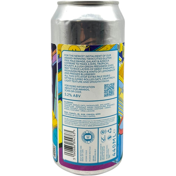 For the newest instalment of our award-winning Twin Cities Gluten Free Pale range, Galaxy & Azacca combine to make a ripe, tropical bounty. A lush green freshness gives way to rich layers of sweet pineapple, redhaven peach & hints of lemonbalm and pressed blueberry. All this sits atop Extra Pale Maris Otter & jumbo rolled oats, creating a light texture and smooth finish.