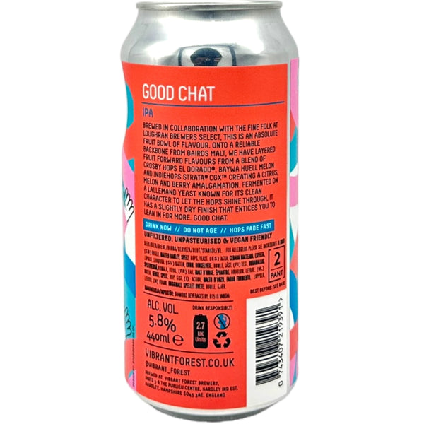 Brewed in collaboration with the fine folk at Loughran Brewers Select, this is an absolute fruit bowl of flavour. Onto a reliable backbone from Bairds Malt, we have layered fruit forward flavours from a blend of Crosby Hops El Dorado®, BayWa Huell Melon and IndieHops Strata® CGX™ creating a citrus, melon and berry amalgamation. Fermented on a Lallemand yeast known for its clean character to let the hops shine through, it has a slightly dry finish that entices you to lean in for more. Good Chat.